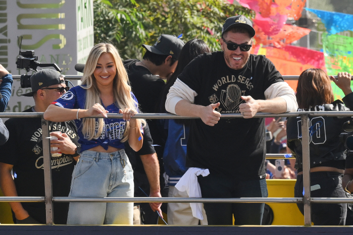 LA 다저스 월드시리즈 우승 카퍼레이드에 참가한 프레디 프리먼 부부. AP연합뉴스 |