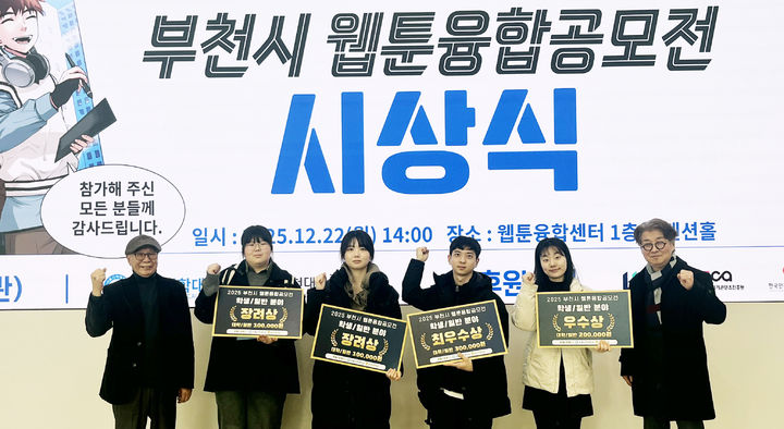 [부천=뉴시스] 강종민 기자 = 22일 경기 부천시 웹툰융합센터에서 열린 서울신학대·부천대 주최 '부천시 웹툰융합공모전' 시상식에서 최우수상을 수항한 부천대 서지원 학생 등 입상자들이 기념촬영을 하고 있다. (사진=부천대 제공) 2025.12.22. photo@newsis.com *재판매 및 DB 금지