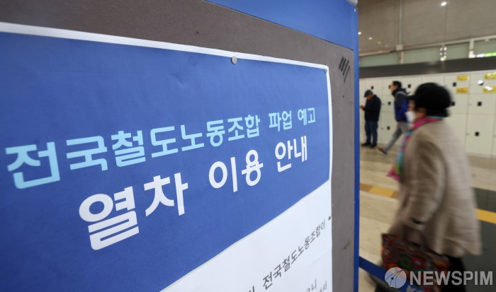 [서울=뉴스핌] 최지환 기자 = 22일 오후 서울 용산구 용산역에 철도노조 파업 예고를 알리는 안내문이 게시되어 있다. 전국철도노동조합은 23일 오전 9시부터 무기한 총파업 돌입을 예고했다. 2025.12.22 choipix16@newspim.com