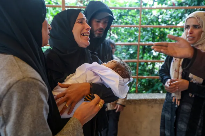 지난 11일(현지시간), 침수된 텐트에서 저체온증으로 숨진 생후 8개월 라하프 아부 자자르의 장례식에서 어머니 하자르가 딸의 시신을 안고 슬퍼하고 있다. 로이터연합뉴스 |