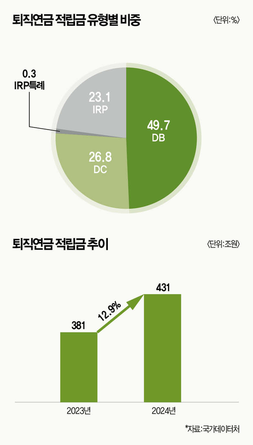 국가데이터처가 발표한 ‘2024년 퇴직연금 통계’에 따르면 DB형·DC형·개인형 IRP를 포함한 퇴직연금 총 적립 금액은 431조원으로 나타났다. 전년(381조원)보다 49조원 증가했다. 이 중 DB형 비중은 49.7%로 나타났다. DB형 비중이 50% 아래로 떨어진 건 통계 작성 이후 이번이 처음이다.