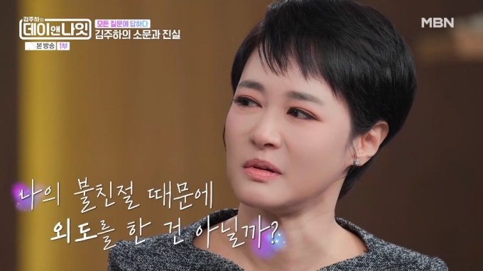 김주하는 "'내가 화를 많이 내서 남편이 바람을 피웠나?' 처음엔 그렇게 생각하고 내 잘못이라 생각했다"고 말했다.