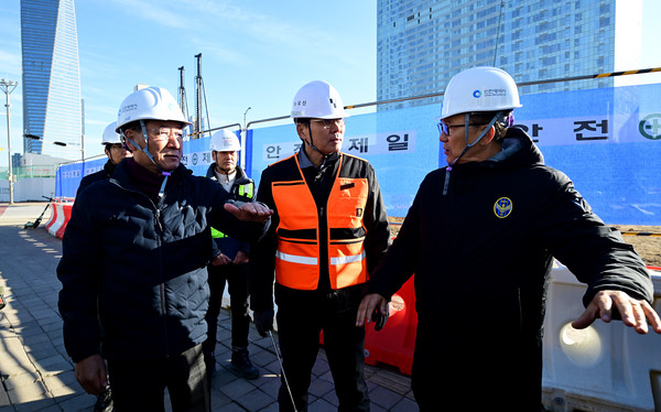 유정복 인천시장(맨 좌측)이 22일 연수구 인천대입구역에서 GTX-B 사업 현장을 점검하고 있다. 사진=인천시 |