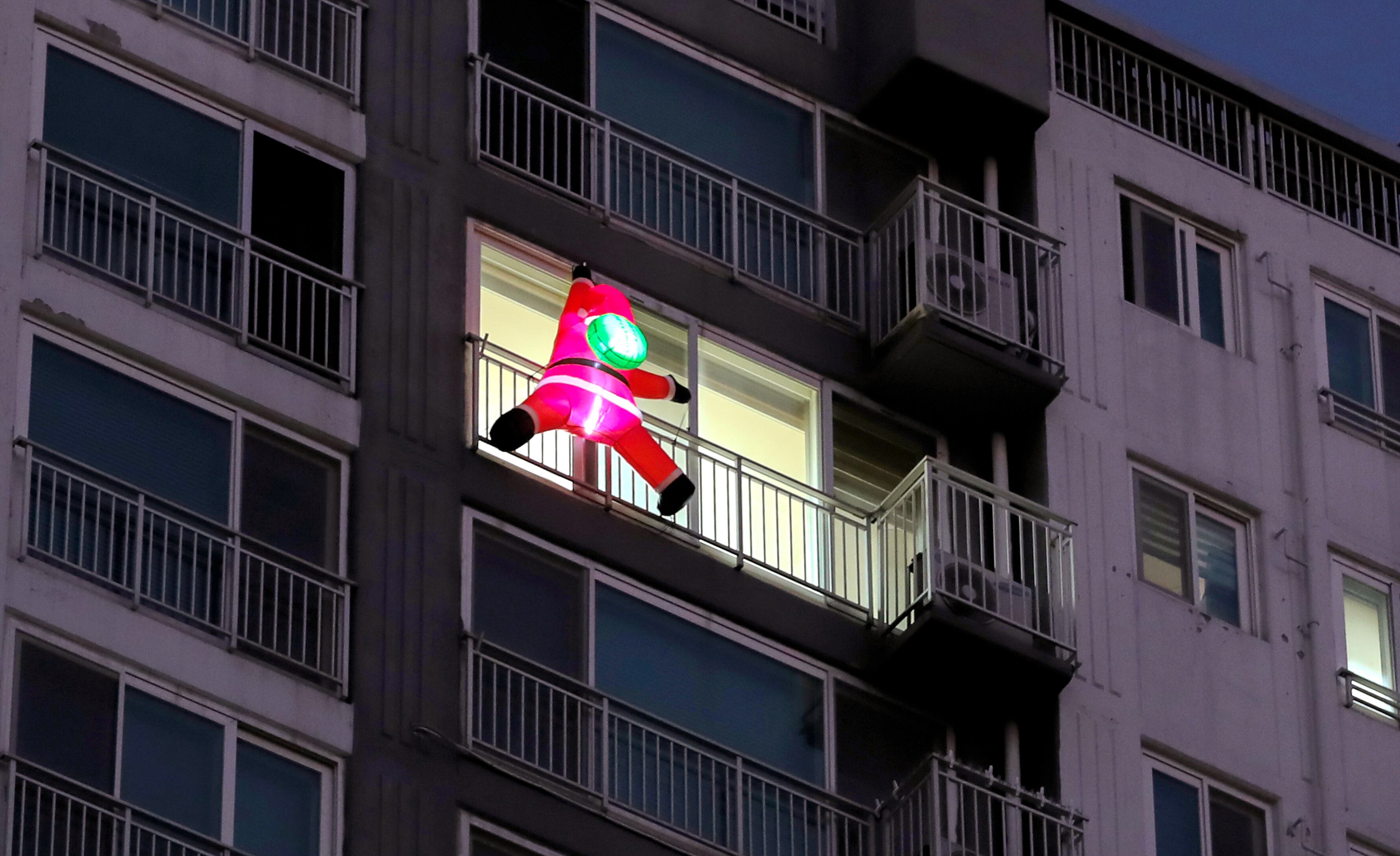 크리스마스를 앞둔 21일 밤 광주광역시 한 아파트 외벽에 아슬아슬하게 산타클로스가 매달려 있다. 다시 보니 풍선 인형이다. 발코니 난간을 붙잡고 몰래 선물을 두고 갈 기회를 엿보는 모양새다. 익살스러운 산타의 모습은 성인들에게도 웃음을 안긴다. 삭막해 보이던 도심 아파트에 잠시나마 온기가 흐른다. 어린 시절에 산타를 믿는 것, 산타가 ‘살아 있게’ 보호하는 것은 예방접종만큼 중요하다. 내일은 크리스마스 이브. 선물을 기다리며 잠들 세상의 아이들에게 열일하는 산타가 인사를 건넨다. “메리 크리스마스!”