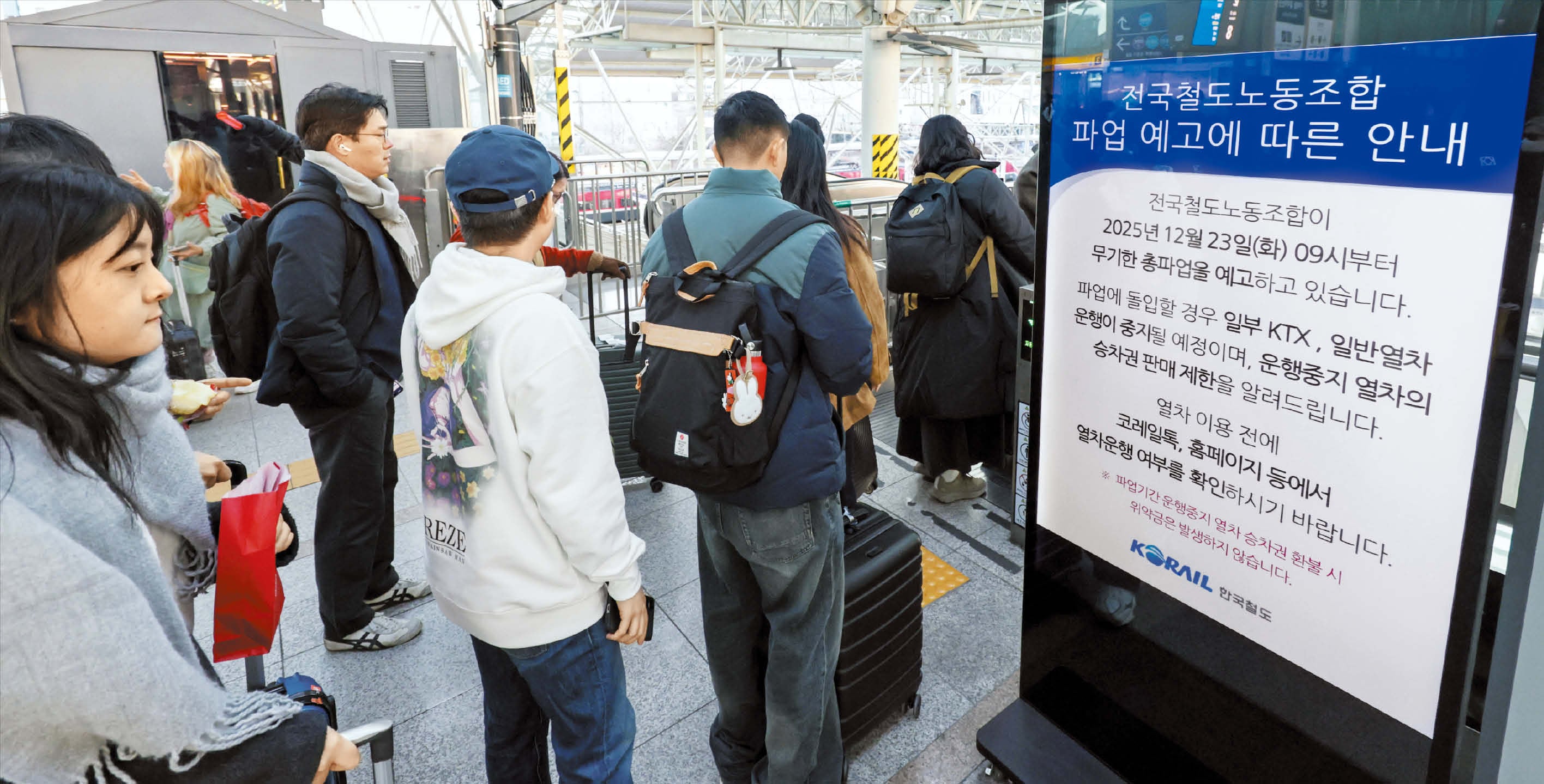 전국철도노조가 23일 오전 9시부터 무기한 총파업에 돌입할 예정인 가운데, 하루 전날인 22일 서울역에 파업 예고 안내문이 붙어 있는 모습. 코레일 측은 “열차 운행이 차질을 빚을 가능성이 있다”며 “운행 정보를 미리 확인해 달라”고 했다. 파업 기간 중 수도권 전철은 평시 대비 75.4%(출근 시간대는 90% 이상 운행), KTX는 66.9%, 새마을호는 59%, 무궁화호는 62%의 운행률을 보일 전망이다. 현재 철도노조는 정부에 “성과급 기준을 현재 ‘기본급의 80%’에서 ‘기본급의 100%’로 바꿔달라”며 파업을 예고한 상태다.