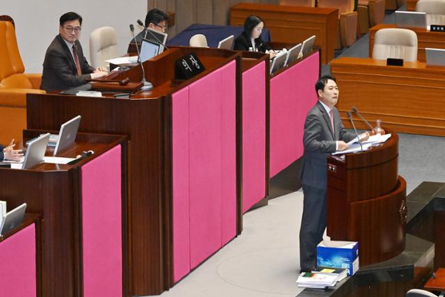 장동혁 국민의힘 대표가 22일 국회 본회의에서 더불어민주당이 주도해 상정한 내란전담재판부 설치법에 대한 필리버스터(무제한 토론을 통한 합법적 의사진행 방해)를 하고 있다. 장 대표는 성낙인 서울대 법대 명예교수의 '헌법학', 존 스튜어트 밀의 '자유론' 등 책 5권을 지참해 연단에 올라 해당 법안의 위헌성을 주장했다. 야당 대표가 필리버스터에 나선 것은 헌정사상 처음이다. 민경석 기자