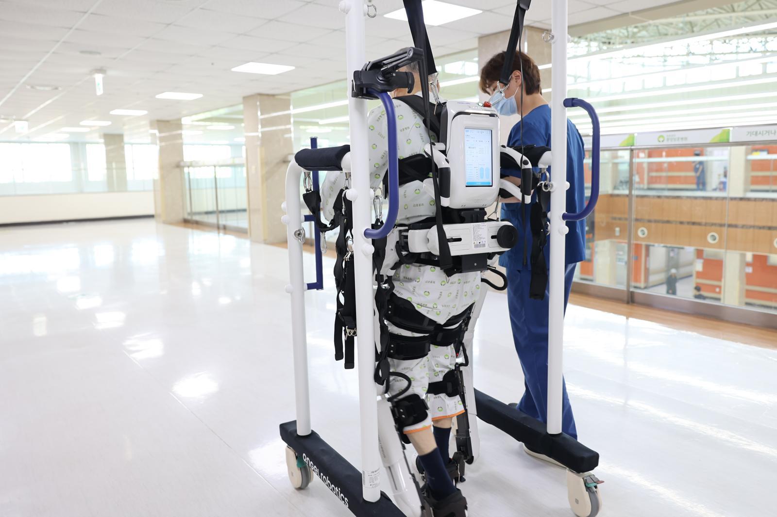 보행재활로봇을 통해 재활 치료를 받고 있는 보훈병원 환자. |