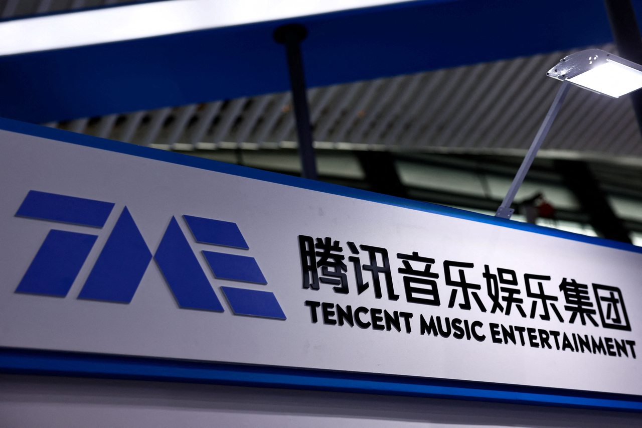 2025년 11월 8일 중국 저장성 퉁샹시 우전에서 열린 세계인터넷대회(WIC) 박람회에서 텐센트 뮤직 엔터테인먼트의 부스에 회사 로고 간판이 전시돼 있다.[로이터]