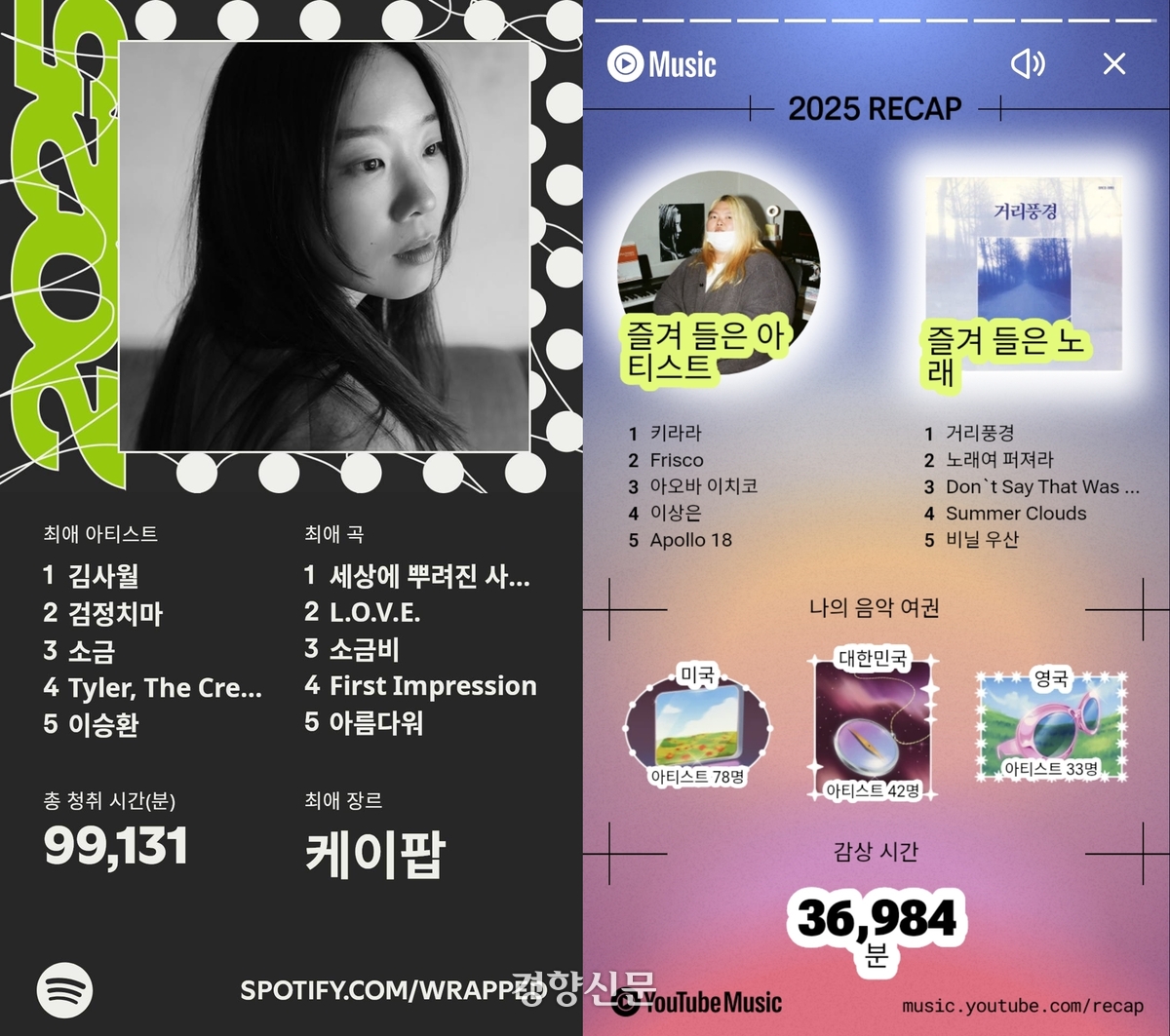 스포티파이(왼쪽)와 유튜브 뮤직(오른쪽)의 연말 음악 리캡(요약). 사회관계망서비스(SNS) 갈무리 |