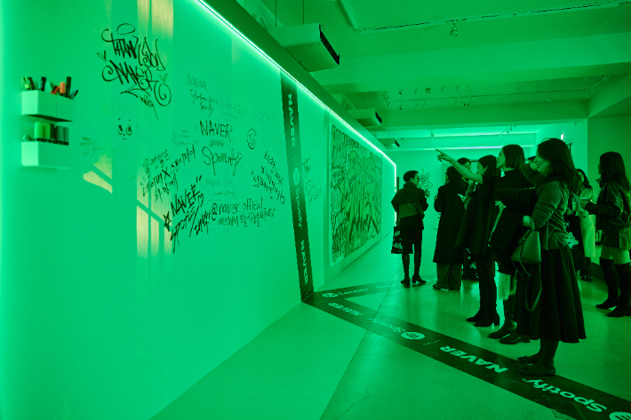 네이버-스포티파이 오프라인 팝업 스토어의 방문객이 '그래피티존'을 체험해 보며 몰입감 있게 콘텐츠를 경험하고 있다. 네이버 제공 |