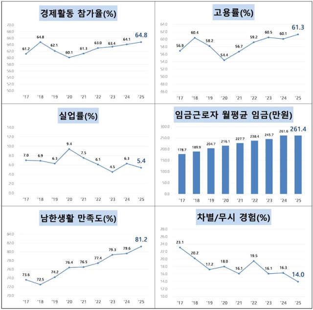 북한이탈주민의 남한 생활 만족도가 조사 이래 최고치를 기록했다. 경제활동 참가율과 고용률 등 양적 지표가 지난해보다 개선된 탓으로 분석된다.