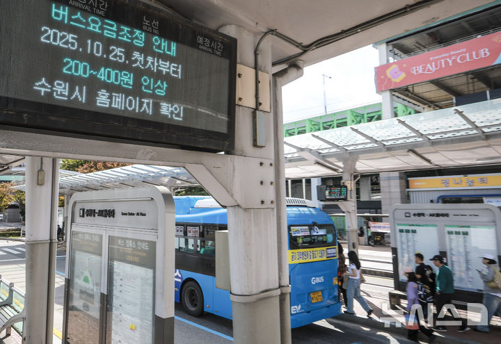 [수원=뉴시스] 정병혁 기자 = 경기 수원시 수원역 인근 버스정류장 전광판에 버스요금조정 안내문이 나오고 있다. 2025.10.24 jhope@newsis.com |