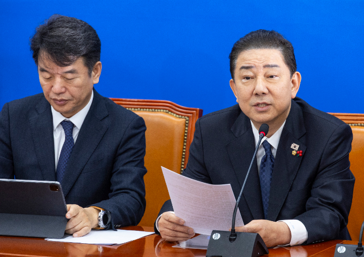 더불어민주당 김병기 원내대표가 23일 국회에서 열린 원내대책회의에서 발언하고 있다. 연합뉴스 |