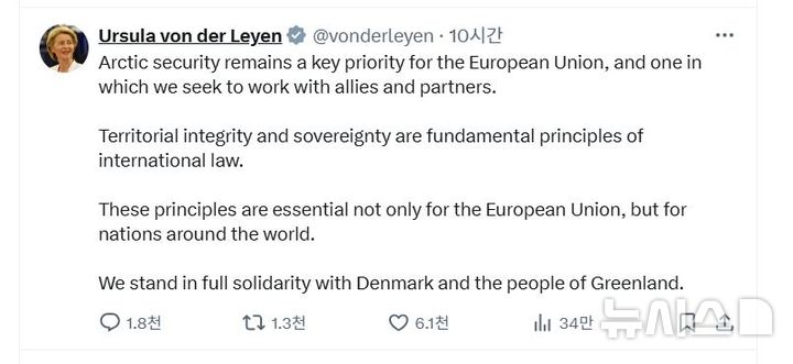 이어 "북극 안보 문제는 EU의 핵심 우선 과제이고 우리는 동맹국 및 파트너들과 협력해 이 문제에 대응하고자 한다"며 "영토 보전과 주권은 국제법의 기본 원칙이다. 이 원칙들은 EU 뿐만 아니라 전 세계 국가들에게도 필수적"이라고 했다.