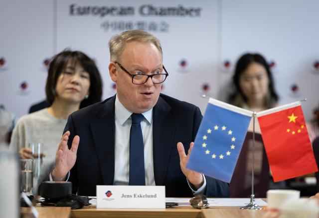 옌스 에스켈룬드 중국 주재 EU 상공회의소 회장이 지난달 17일 중국 베이징에서 열린 기자회견에서 발언하고 있다. [사진=EPA연합뉴스] |