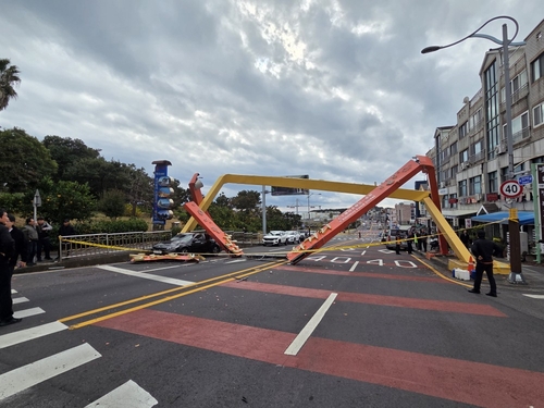 (서귀포=연합뉴스) 백나용 기자 = 23일 오후 1시 39분께 제주 서귀포시 서귀동 한 도로에서 60대 운전자가 몰던 5t 윙바디 트럭 적재함이 칠십리로 음식특화거리 아치형 조형물에 부딪히는 사고가 발생했다.