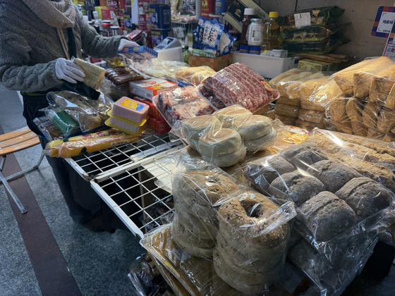 22일 남대문시장에서 상점 주인 안모(73)씨가 자신이 파는 수입 치즈·육류·빵 등을 정리하고 있다. 남수현 기자