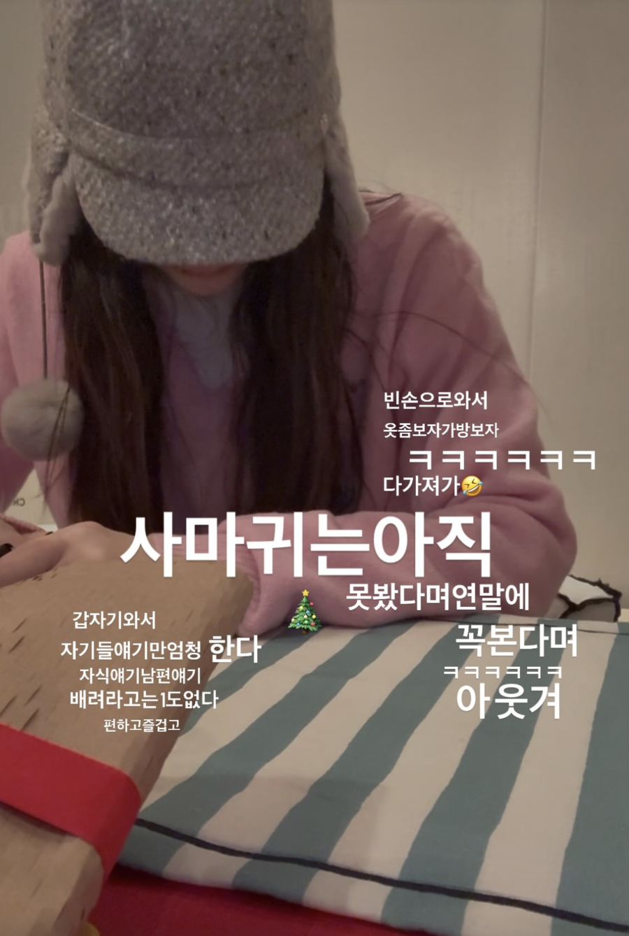 23일 고현정은 자신의 개인 계정을 통해 지인들과 만난 자리에서의 자신의 사진을 공개했다. 이어 그는 "빈 손으로 와서 옷 좀 보자, 가방 보자 다 가져가. 갑자기 와서 자기들 이야기만 엄청 한다. 자식 이야기, 남편 이야기, 배려라고는 1도 없다"라고 적었다. 이어 그는 "'사마귀'는 아직 못 봤다며 연말에 꼭 본다며 아 웃겨, 편하고 즐겁고"라고 덧붙였다.