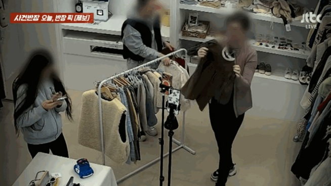 여성들은 매장 내 의류를 가리키며 홈쇼핑처럼 설명했다. 잠시 후 이를 수상하게 여긴 건물의 관리소장이 매장에 들어와 "뭐 하는 거냐"고 묻자, 여성들은 황급히 짐을 챙겨 가게 밖으로 나갔다.