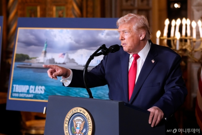 도널드 트럼프 미국 대통령이 22일(현지시간) 플로리다주 팜비치의 마러라고 별장에서 기자회견하고 있다. 트럼프 대통령은 "지난주 해군이 발표한 신예 프리깃함(호위함) 건조는 한국의 한화와 협력할 것"이라고 말했다. / AP=뉴시스 |
