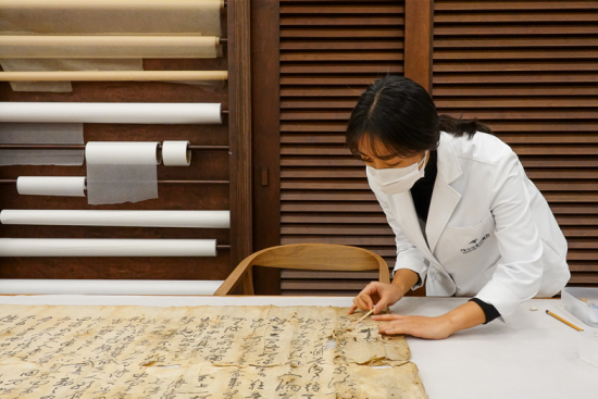 대구간송미술관 수리복원 전문 학예사가 '권문해유서'의 수리복원 과정을 진행하고 있다. 대구간송미술관 제공 |