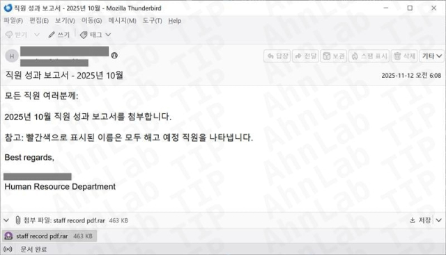 안랩은 최근 임직원 성과 보고서로 위장한 악성코드를 유포하는 피싱 메일을 발견했다고 24일 밝혔다. 안랩이 공개한 사례에서 공격자는 기업 인사팀을 사칭해 '직원 성과 보고서'라는 제목의 메일을 발송했다.