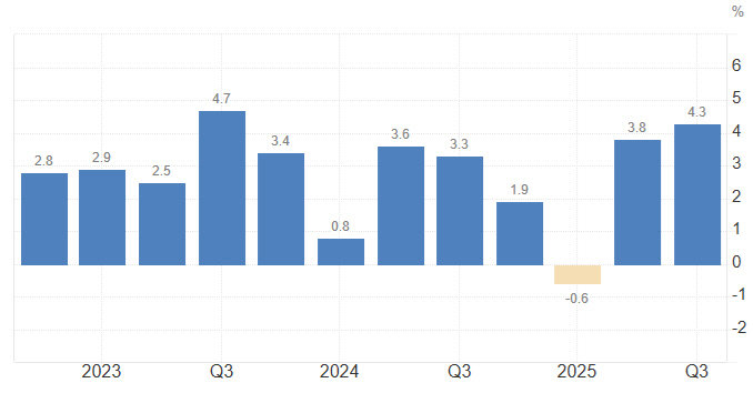 미국 분기별 경제성장률 추이. 연율 기준. 3분기 4.3%. 출처 트레이딩이코노믹스 |