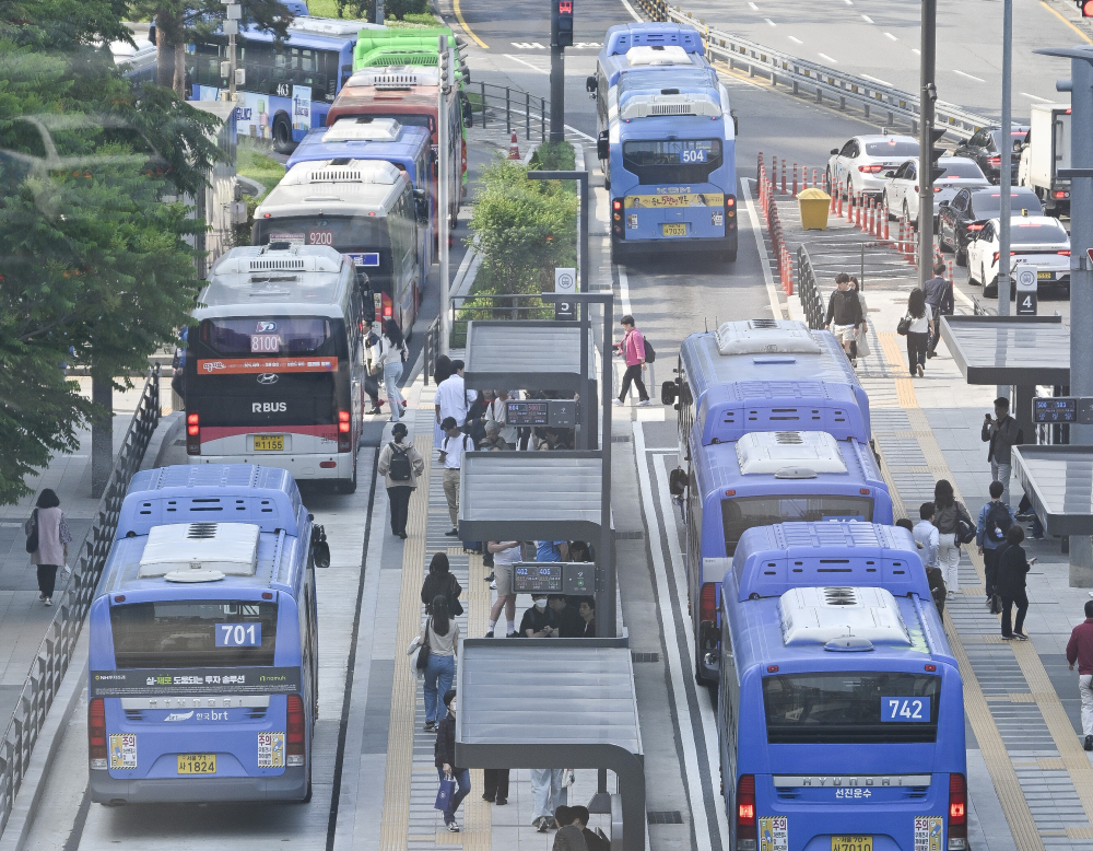 서울 용산구 서울역버스환승센터 정류장에 버스들이 줄지어 서 있다. |