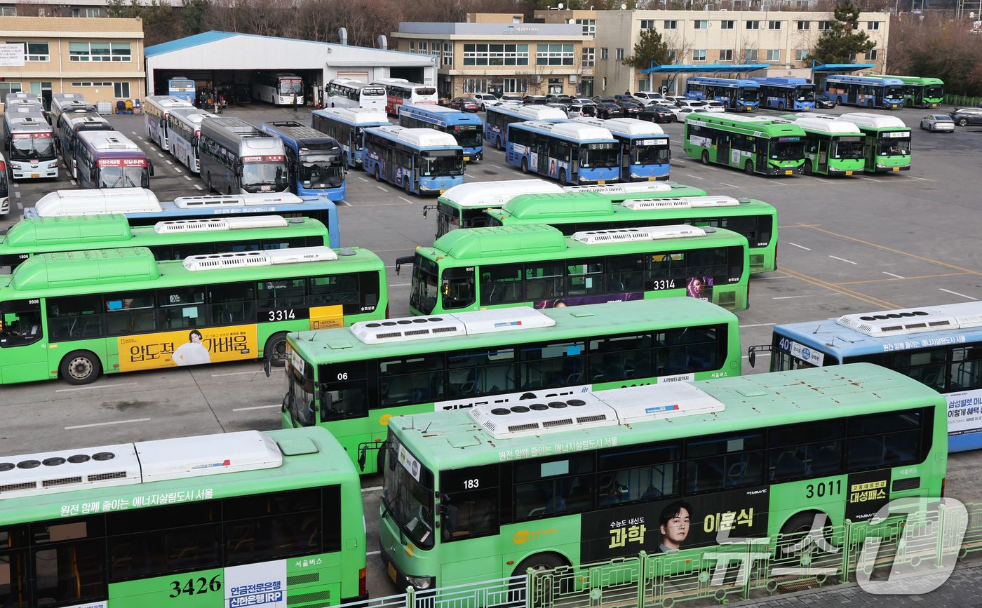 (서울=뉴스1) 장수영 기자 = 24일 서울 송파구 장지공영차고지에 시내버스가 줄지어 세워져 있다 서울 시내버스 노사가 임금·단체협약(임단협) 협상에서 합의에 이르지 못한 가운데 노조는 내년 1월 13일 전면 파업에 나서기로 했다. 2025.12.24/뉴스1