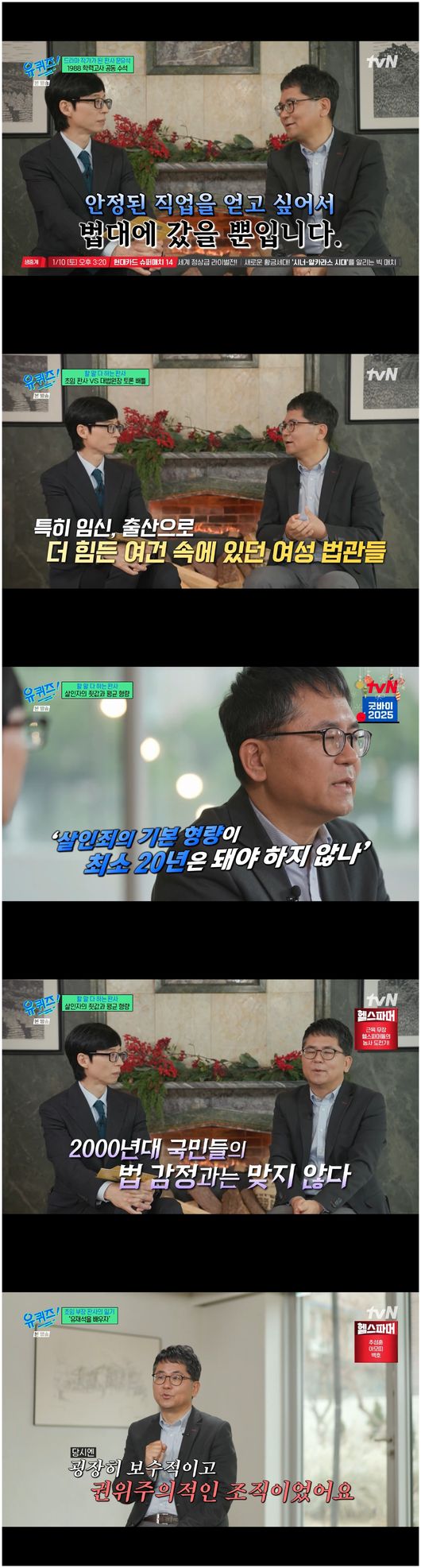 유재석은 “낮은 형량에 대해서도 목소리를 냈다고”라고 말했다. 문유석 작가는 “법관 토론하는 게시판에 글을 올렸다. 살인죄에 대해 형량은 20년은 되어야 한다고 했다. 20년 전 기준 제가 조사했을 때 살인죄를 지으면 형량 12~13년이더라. 이게 평균 수명이 50세였던 시절에 정한 거다. 선배들의 판결을 답습하다 보니 보수적인 조직이라 그대로 답습한 것 같다. 국민적 법 정서랑 안 맞고, 사람 한 명 죽였을 때 형량을 더 올려야 하지 않냐고 토론에서도 말했다”라며 자신의 생각을 밝혔다./osen_jin0310@osen.co.kr