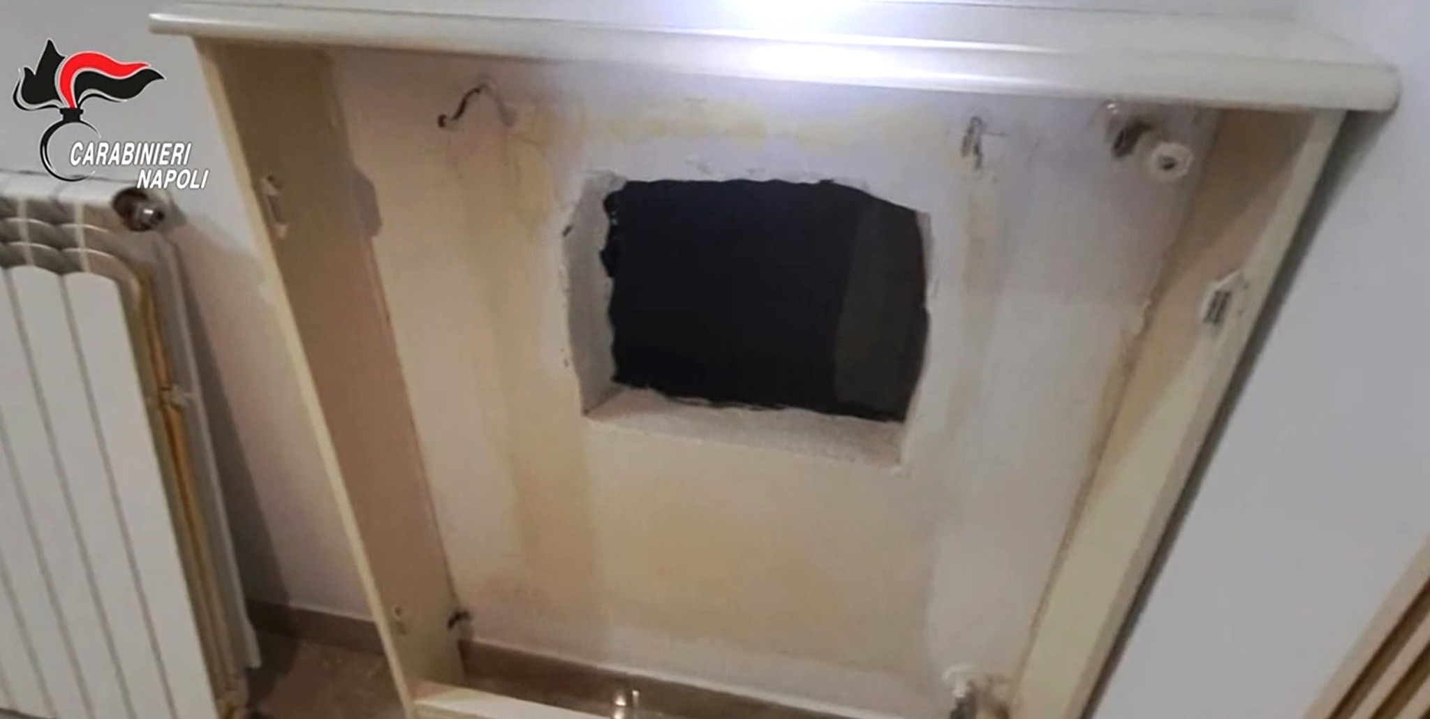 이탈리아 마피아 카모라 두목 치로 안돌피의 은신공간 입구. 라디에이터를 들어내자 은신공간으로 들어가는 직사각형 모양의 입구 구멍이 모습을 드러냈다. 사진 나폴리 경찰 공개 영상 캡처