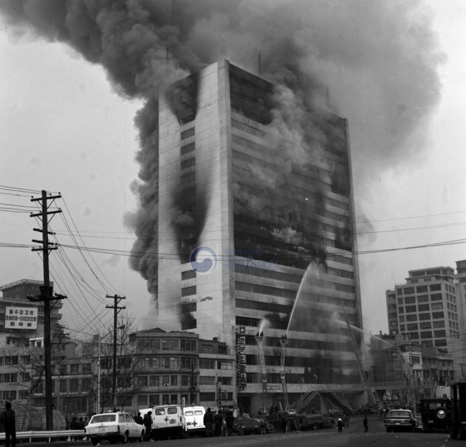 54년 전 크리스마스 당일 서울 중구에 위치한 대연각 호텔에서 대형 화재가 발생했다. 방화문 하나 없는 계단은 1층의 불길을 꼭대기 층까지 실어 나르는 통로가 됐고, 굳게 잠긴 옥상문은 사지로 내몰린 이들의 마지막 희망마저 끊어버렸다. 그렇게 163명이 돌아오지 못할 길을 떠났다.사진=국가기록원 |