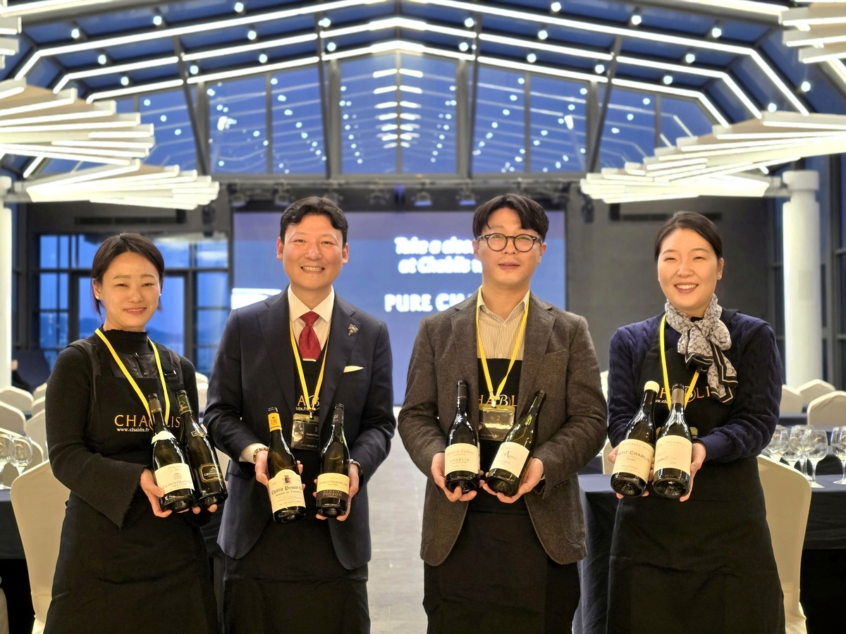 샤블리 와인을 소개하는 홉스코치 코리아(옛 소펙사 코리아) 한국소믈리에대회 역대 우승자들. 왼쪽부터 윤효정, 김주용, 이형택, 양윤주 소믈리에. 최현태 기자 |