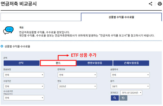 금융감독원은 25일 이같은 내용의 금융상품 비교공시 시스템 개선 계획을 밝혔다. 금감원에 따르면 현재 통합연금포털은 연금저축 상품인 신탁·펀드·보험의 수익률 등은 분기별로 공시하지만, ETF 관련 정보는 제공하지 않고 있다. 그러나 앞으론 연금저축 상품 비교 공시에 ETF를 추가한다.