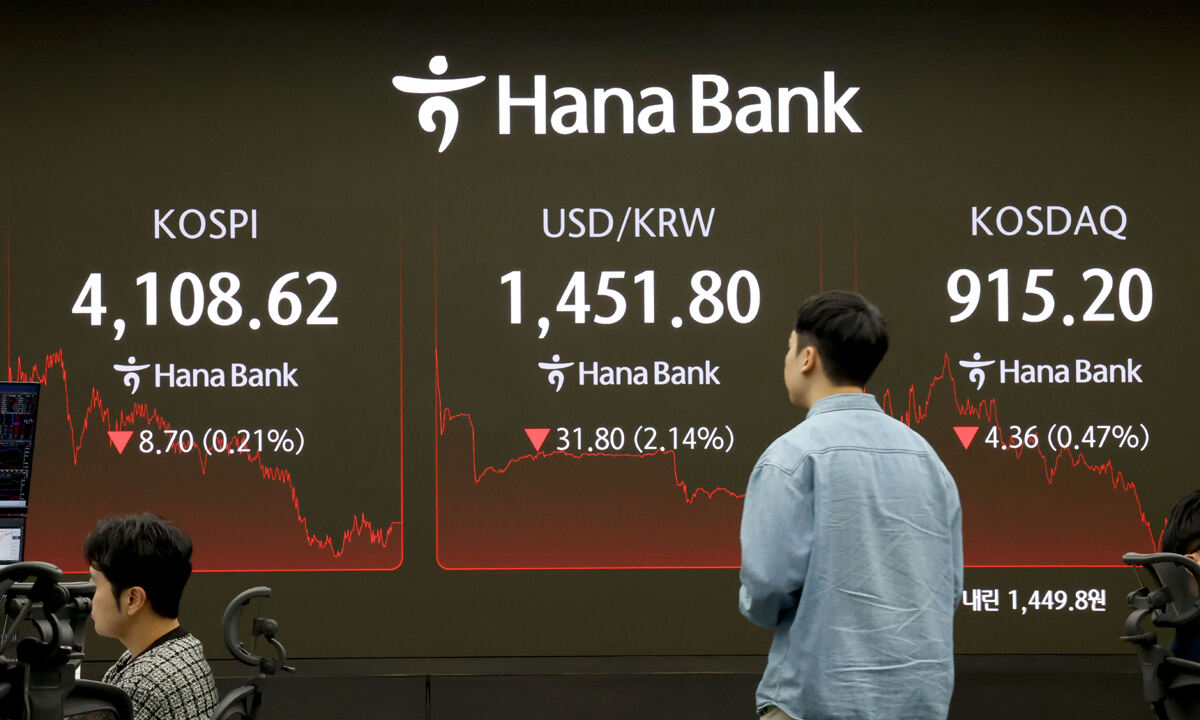 코스피 지수가 하락 마감한 지난 24일 서울 중구 하나은행 본점 딜링룸 현황판에 전장보다 8.70포인트(0.21%) 하락한 4,108.62를 나타내고 있다. 이날 원/달러환율은 정부의 환율 대책과 당국의 구두 개입에 30원 넘게 급락, 코스닥 지수는 전장보다 4.36포인트(0.47%) 하락한 915.20에 장을 마쳤다. 뉴스1 |