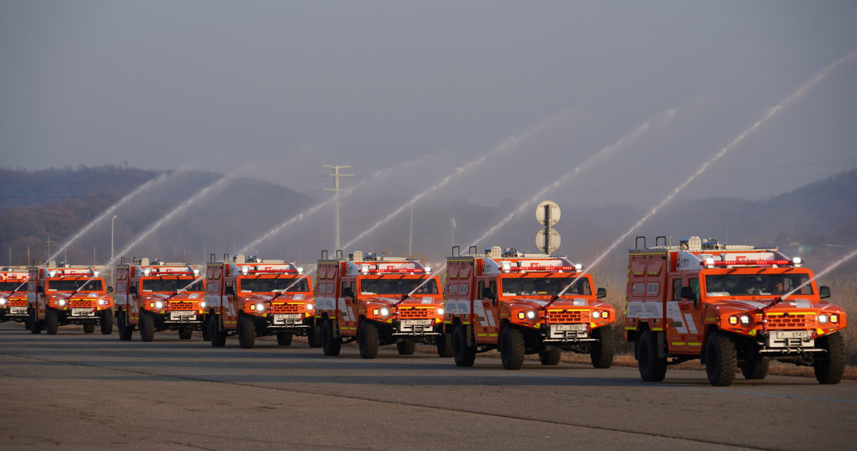 산림청은 24일 경기도 화성시 TS한국교통안전공단 자동차안전연구원에서 국산 군용차를 기반으로 제작한 다목적 산불진화차량 64대의 출고 기념식을 열었다고 26일 밝혔다.