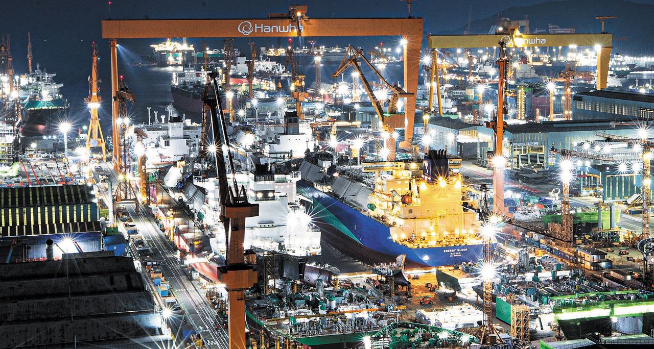 지난 18일 오전 경남 거제시 한화오션 거제사업장이 환하게 밝혀진 가운데 세계에서 수주한 선박들이 건조되고 있다. K조선업은 한미 조선 협력을 통한 미국 진출 등의 변화가 이어지는 가운데 다시 도약의 시기를 맞았다는 분석이다.
