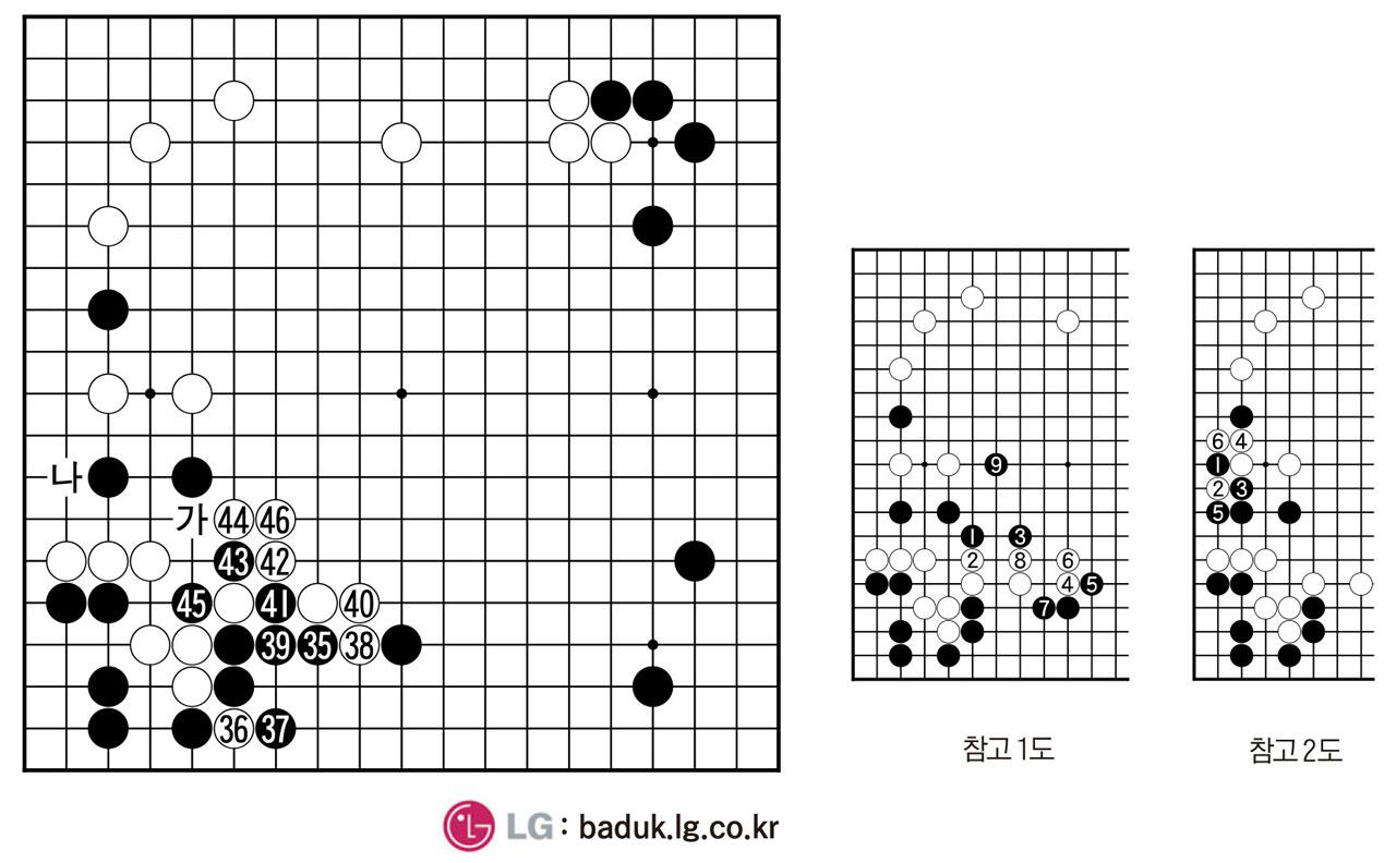 <제4보>(35~46)=5대5로 팽팽하게 흘러가던 국면에서 35가 실리를 너무 밝혔다. 이 수로 인해 형세 그래프가 백 쪽으로 20%포인트 가량 올라갔다. 참고 1도 1, 3이 행마의 리듬을 타는 자연스러운 흐름. 4~8 정도일 때 9로 자세를 잡아서 충분했다. 또 하나, 참고 2도의 1도 종종 사용되는 맥점인데 이 국면에서는 4가 적절한 호수라서 흑이 별것 없다.