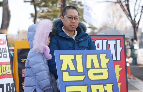지난 24일 서울 용산 대통령실 앞에서 제주항공 참사 유가족인 고재승(44)씨가 그의 6살 딸과 함께 1인 시위를 하고 있다. 변선구 기자. |