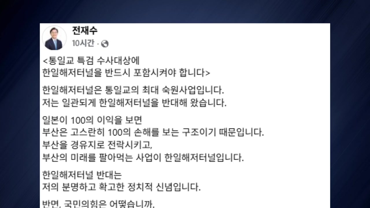 전 의원은 자신의 SNS에, 박형준 부산시장을 포함한 숱하게 많은 국민의힘 의원들이 한일해저터널과 관련한 통일교 계열 단체들과 십수 년간 접촉하고 참여하고 우호적인 입장을 밝혀 왔다며 이같이 말했습니다.