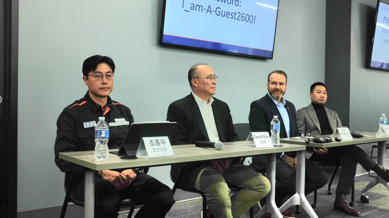조종우(왼쪽부터) 한화필리조선소 소장(상무)과 데이비드 김 한화필리조선소 최고경영자(CEO), 톰 앤더슨 한화디펜스USA 사장, 알렉스 웡 한화그룹 최고전략책임자(CSO)가 미국 필라델피아 한화필리조선소에서 국내 언론과 간담회를 진행하고 있다. 박혜원 기자 |