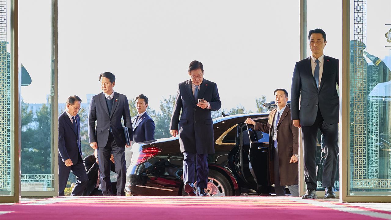 ▲ 이재명 대통령이 26일 용산에 위치한 집무실로 출근하고 있다.
