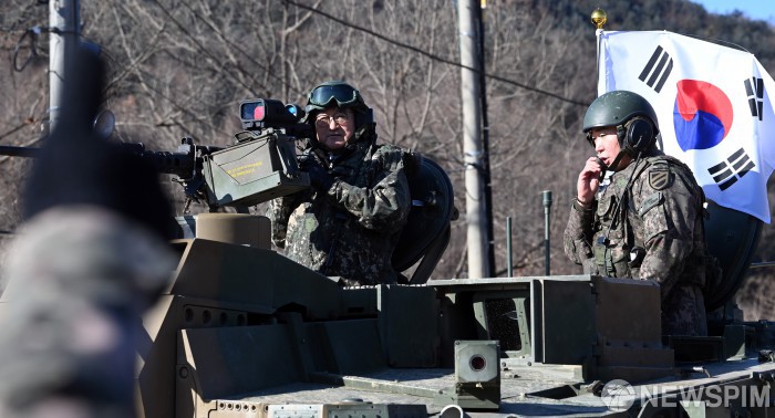 [양평=뉴스핌] 국회사진기자단 = 우원식국회의장이 26일 오전 경기 양평군 제11기동사단 108기계화보병대대에서 K2 전차에 탑승해 부대를 이동하고 있다. 2025.12.26 photo@newspim.com