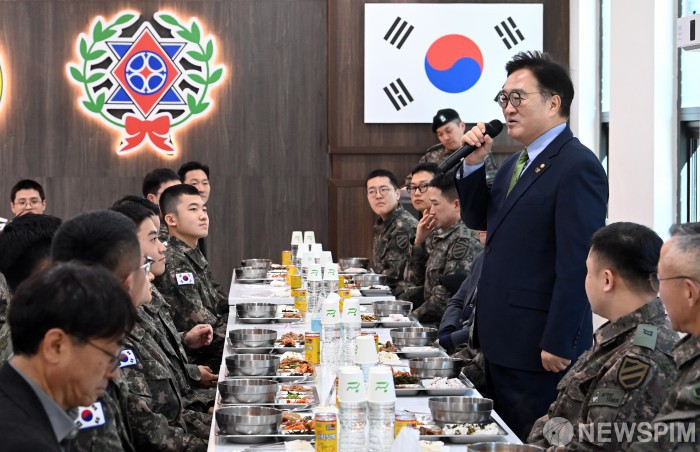 [양평=뉴스핌] 국회사진기자단 = 우원식 국회의장이 26일 경기 양평군 제11기동사단 108기계화보병대대를 방문해 장병들과 오찬을 갖고 인사말을 하고 있다. 2025.12.26 photo@newspim.com |