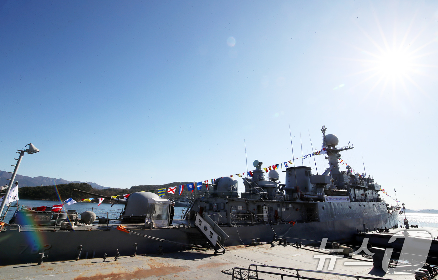 (창원=뉴스1) 윤일지 기자 = 26일 경남 창원 진해구 진해 군항에서 국산 초계함 광명함(PCC·1000톤급) 전역식이 열리고 있다. 광명함은 포항급 22번째 초계함으로, 1989년 코리아타코마 조선소에서 건조 후 1990년 7월 취역해 제5성분전단 배치를 시작으로 제1함대사령부, 제3함대사령부 등에서 해역 방어 업무를 수행해 왔다. 76㎜ 및 40㎜ 함포, 대함미사일, 경어뢰 등의 무장을 갖추고 있으며, 1998년 12월엔 전남 여수 앞바다로 침투한 북한 반잠수정을 7시간 추적 후 함포사격으로 격침하기도 했다. 이런 노하우에 기반해 2017년엔 해군 포술 최우수 전투함인 '탑건함'으로 선발됐다. 2025.12.26/뉴스1
