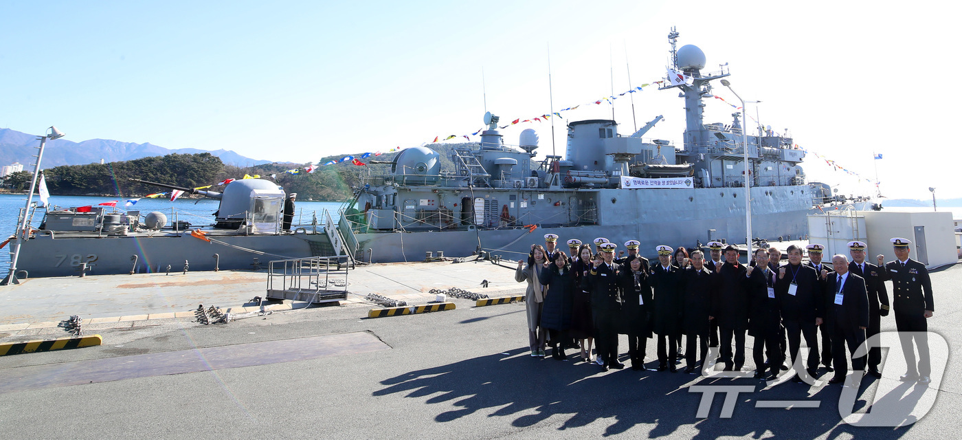 (창원=뉴스1) 윤일지 기자 = 26일 경남 창원 진해구 진해 군항에서 열린 국산 초계함 광명함(PCC·1000톤급) 전역식에서 김경률 해군작전사령관, 광명함 역대 함장 등 참석자들이 기념촬영을 하고 있다. 광명함은 포항급 22번째 초계함으로, 1989년 코리아타코마 조선소에서 건조 후 1990년 7월 취역해 제5성분전단 배치를 시작으로 제1함대사령부, 제3함대사령부 등에서 해역 방어 업무를 수행해 왔다. 76㎜ 및 40㎜ 함포, 대함미사일, 경어뢰 등의 무장을 갖추고 있으며, 1998년 12월엔 전남 여수 앞바다로 침투한 북한 반잠수정을 7시간 추적 후 함포사격으로 격침하기도 했다. 이런 노하우에 기반해 2017년엔 해군 포술 최우수 전투함인 '탑건함'으로 선발됐다. 2025.12.26/뉴스1