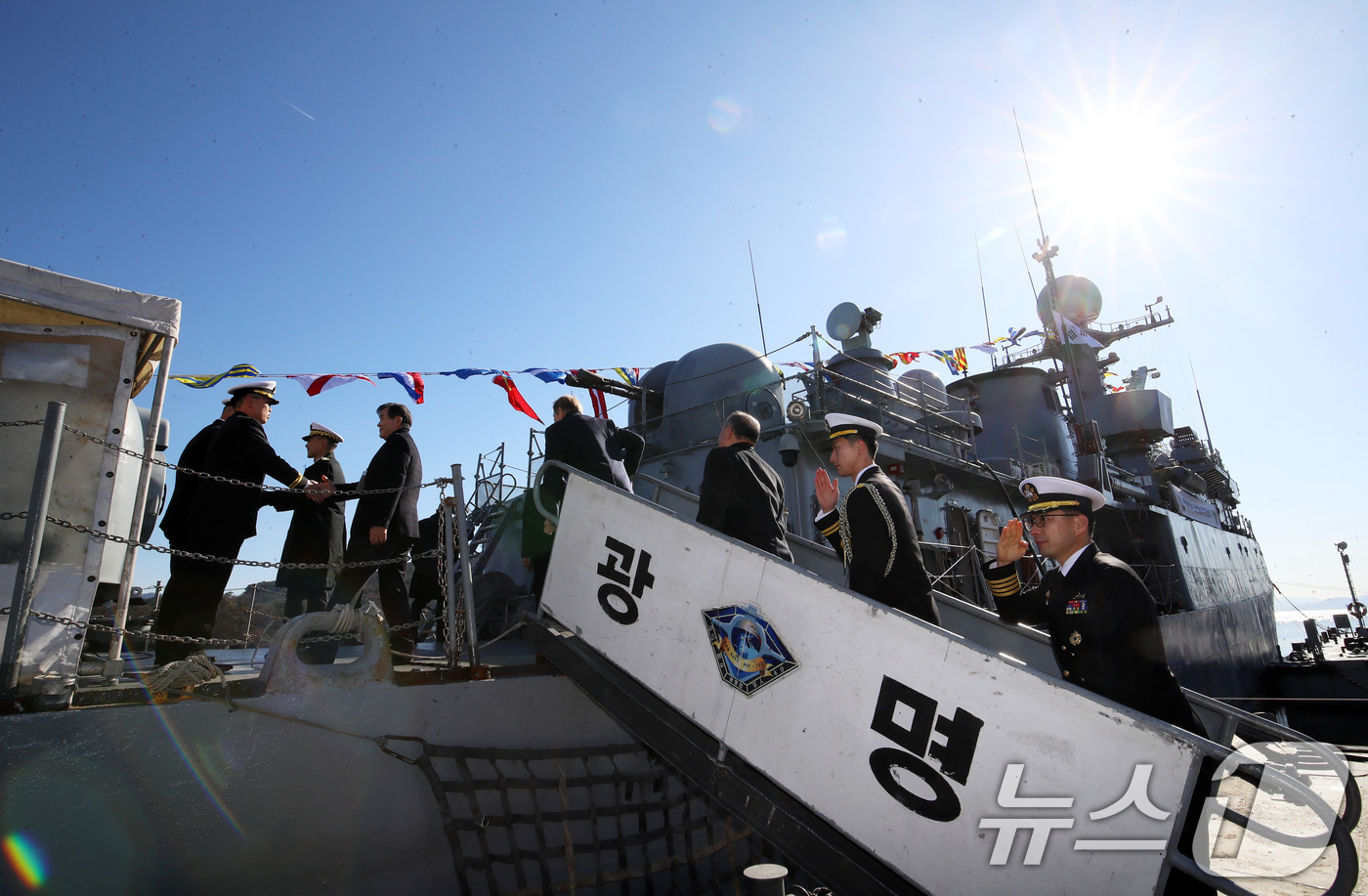 (창원=뉴스1) 윤일지 기자 = 26일 경남 창원 진해구 진해 군항에서 열린 국산 초계함 광명함(PCC·1000톤급) 전역식에서 역대 함장들이 광명함에 오르고 있다. 광명함은 포항급 22번째 초계함으로, 1989년 코리아타코마 조선소에서 건조 후 1990년 7월 취역해 제5성분전단 배치를 시작으로 제1함대사령부, 제3함대사령부 등에서 해역 방어 업무를 수행해 왔다. 76㎜ 및 40㎜ 함포, 대함미사일, 경어뢰 등의 무장을 갖추고 있으며, 1998년 12월엔 전남 여수 앞바다로 침투한 북한 반잠수정을 7시간 추적 후 함포사격으로 격침하기도 했다. 이런 노하우에 기반해 2017년엔 해군 포술 최우수 전투함인 '탑건함'으로 선발됐다. 2025.12.26/뉴스1