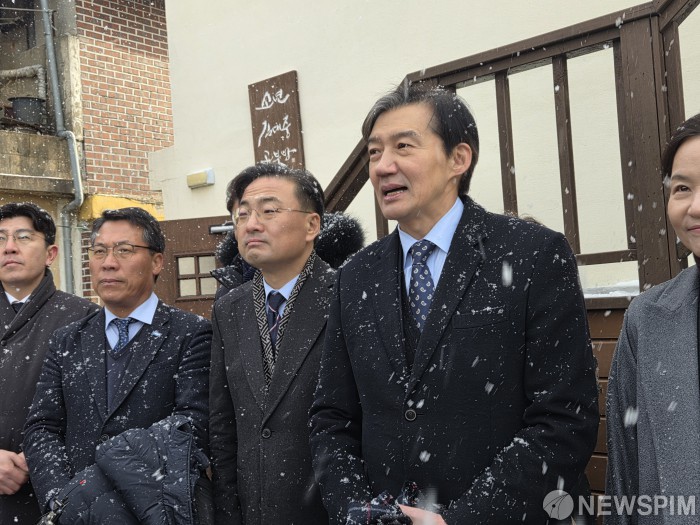 [무안=뉴스핌] 조은정 기자 =조국 혁신당 조국 대표가 26일 오전 전남 목포시 만호동 '소년 김대중 공부방'을 방문해 기자들에게 인사를 하고 있다. 2025.12.26 ej7648@newspim.com