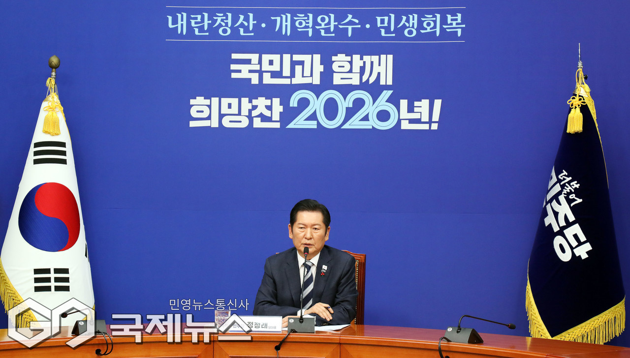 (서울=국제뉴스) 정청래 더불어민주당 대표가 26일 오전 서울 여의도 국회에서 기자회견을 열고 취재진 질문에 답변하고 있다./사진=이용우 기자