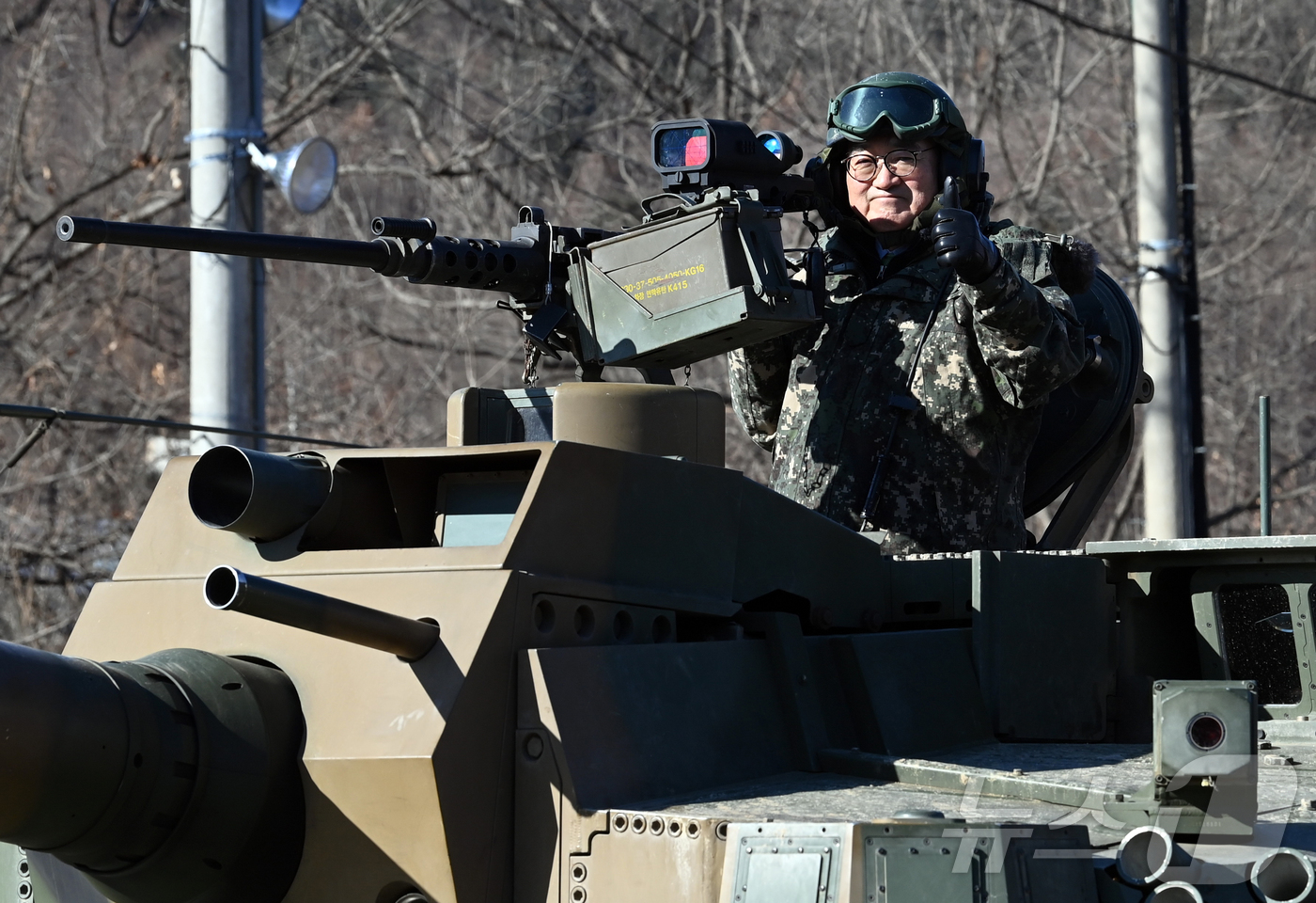 (서울=뉴스1) 국회사진기자단 = 우원식 국회의장이 26일 오전 경기 양평군 옥천면 제11기동사단 108기계화보병대대를 방문, K2전차에 탑승해 부대내를 이동하고 있다. 2025.12.26/뉴스1